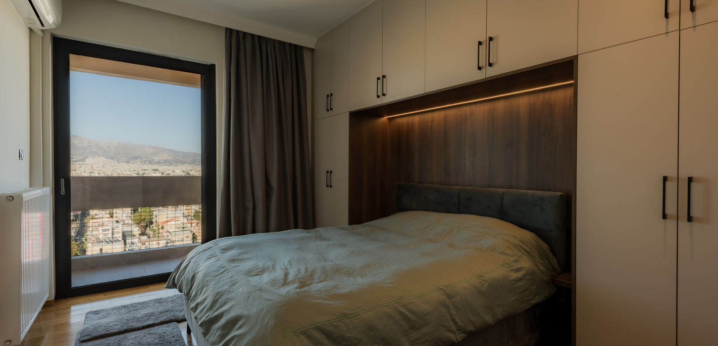 High above the city on the 13th floor, this 75 sq.m. apartment in Neo Psychiko offers sweeping views over the heart of Athens. Thoughtfully renovated with modern elegance, it features an open-plan living and office space, a fully equipped kitchen, one bedroom, and a sleek bathroom.