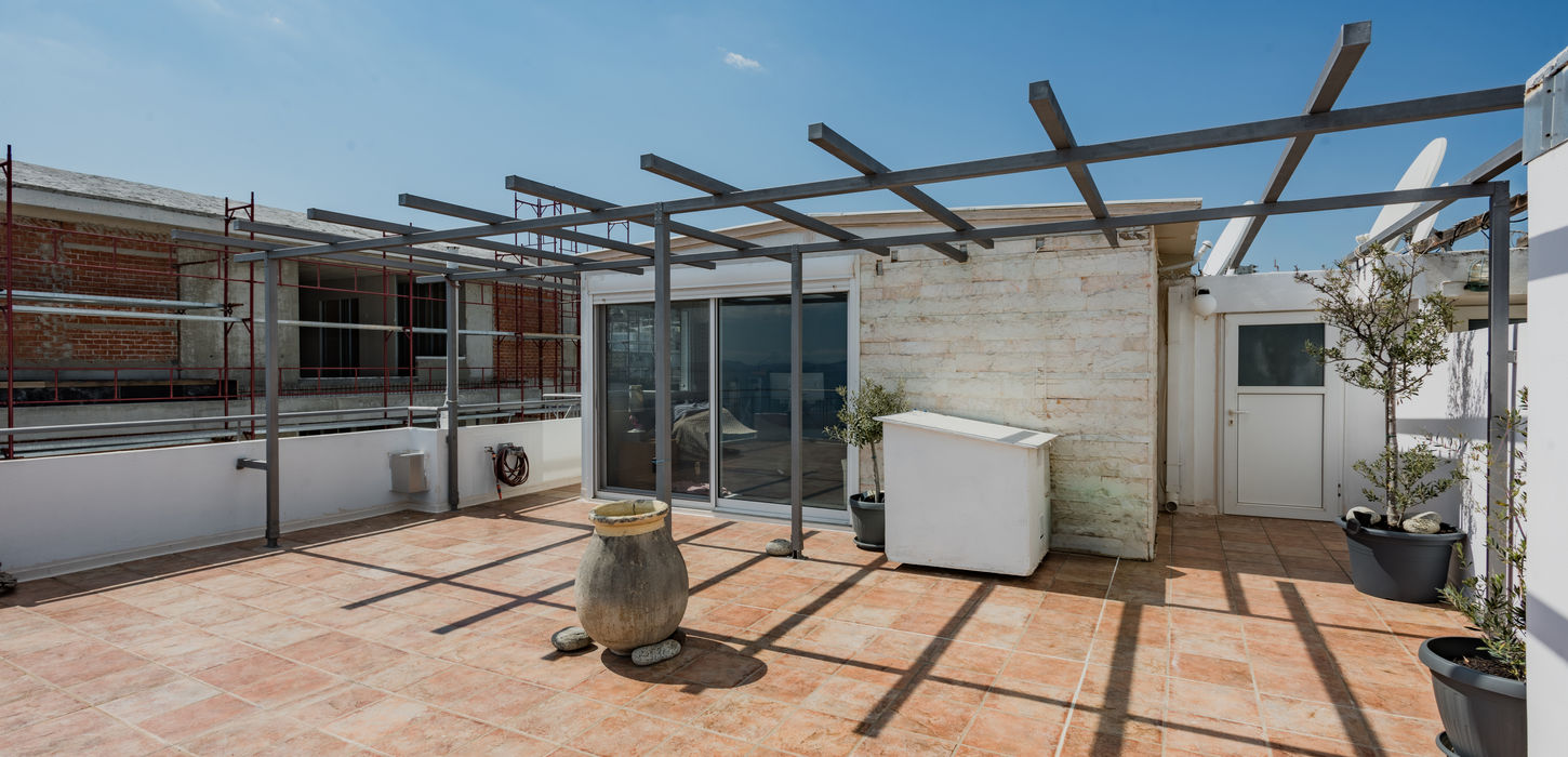 The main floor includes a living room, dining space, kitchen, 2 bedrooms, and a bathroom, while the upper attic level serves as a private master suite with its own terrace.
